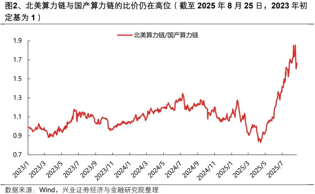 北美算力与国产算力比价来看,仍在高位。我们精选A股中20家北美算力链标的(光模块、PCB等方向)与20家国产算力链标的(国产芯片产业链、服务器等方向),分别构建“北美算力链”与“国产算力链”指数。两者比价来看,4月下旬以来北美算力链已在持续跑赢国产算力链,近期国产算力大涨后,两者比价仍在高位。